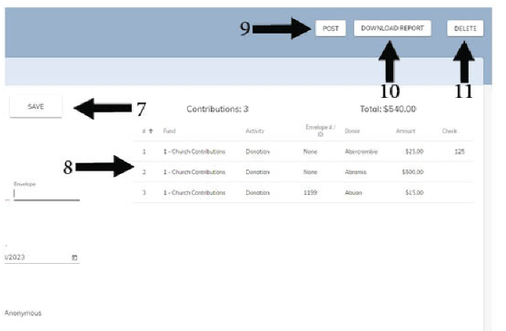 - You will see the finished entries on the right side of the screen, number of contributions in this batch and the total dollar amount