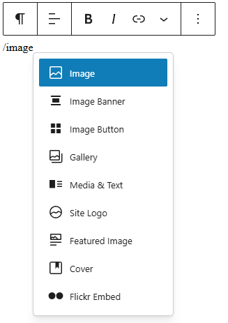 - Create a new block and within the new paragraph type “/image” or click the plus button to add an “Image” block.