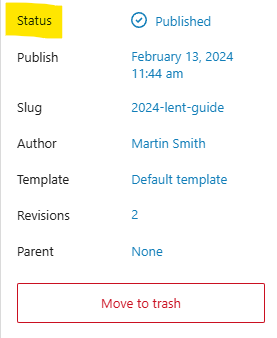 - Locate the Status dropdown under the Page/Post Settings sidebar box on the right side of the page.