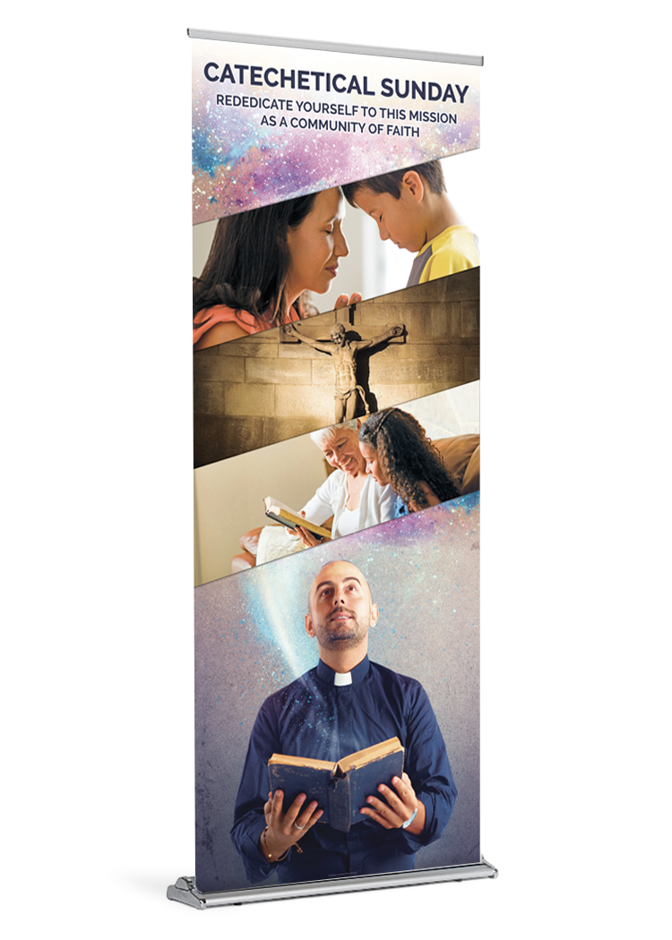 This Catechetical Sunday banner is approximately 84″ tall. It is printed on durable, polypropylene media with archival inks.