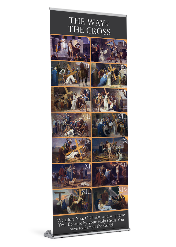 This Lent banner is approximately 84″ tall. It is printed on durable, high quality paper with water resistant inks.