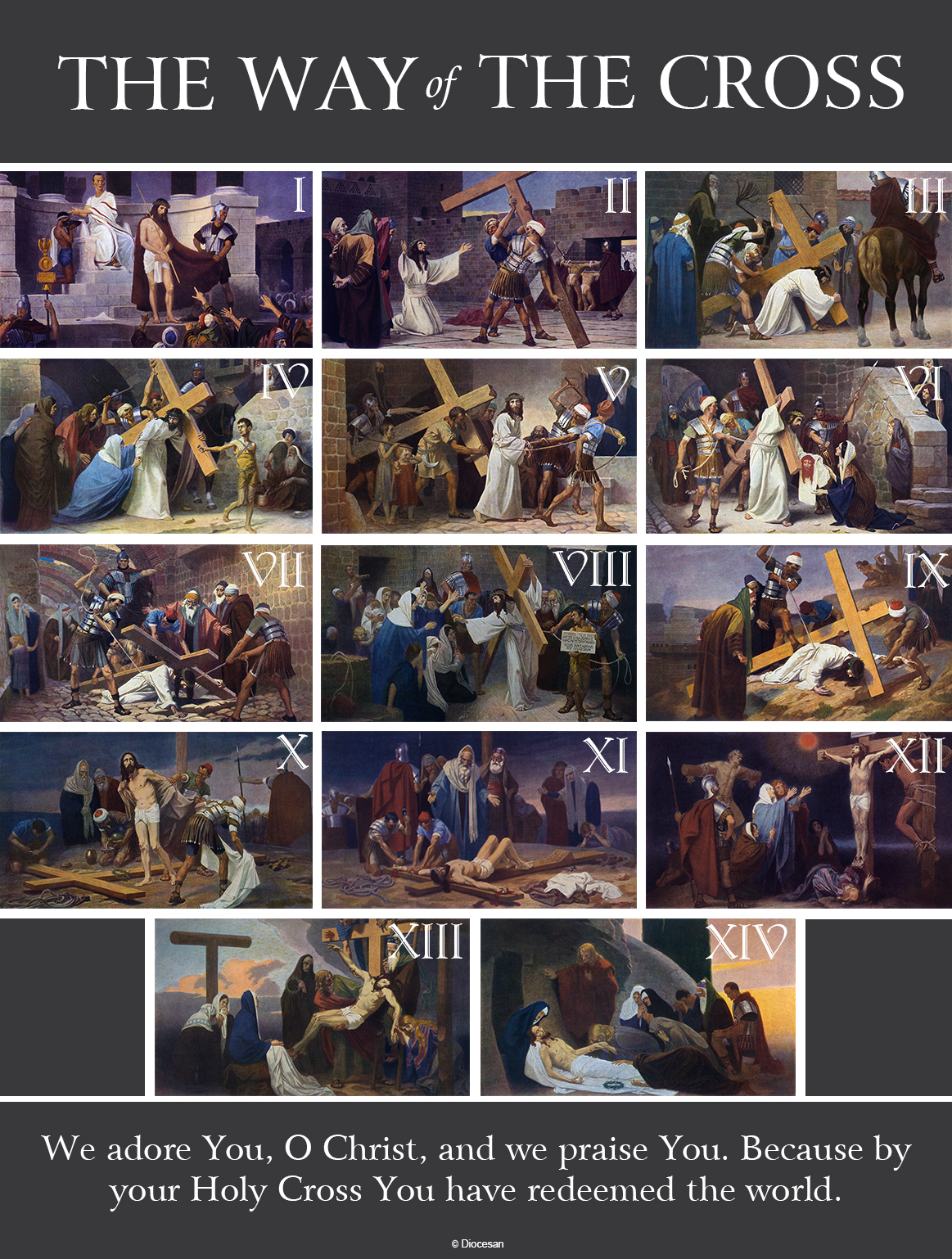 Stations of the Cross art is by Gebhard Fugel. Individual paintings can be found here in our Library of Art.