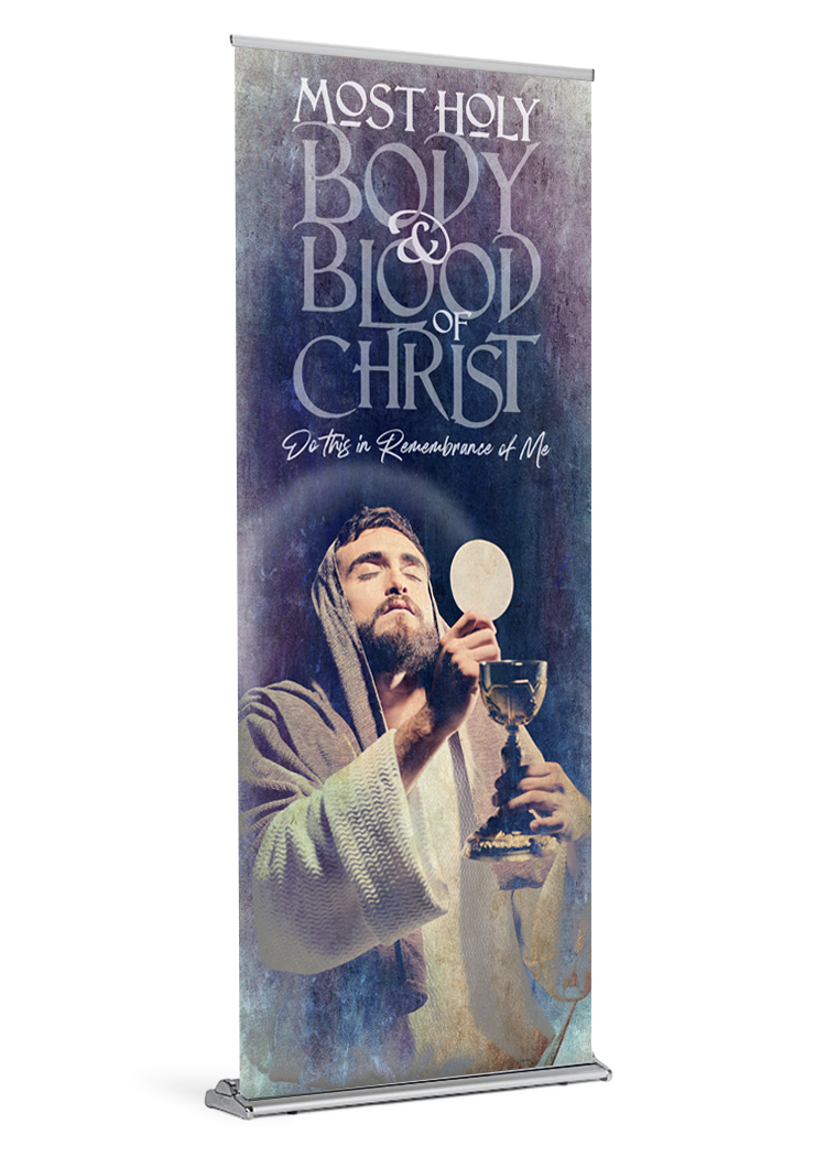 Celebrate our most treasured gift: the Eucharist! This banner is wonderful for the Feast of the Body and Blood of Christ, First Communion, and for Ordinary Time.