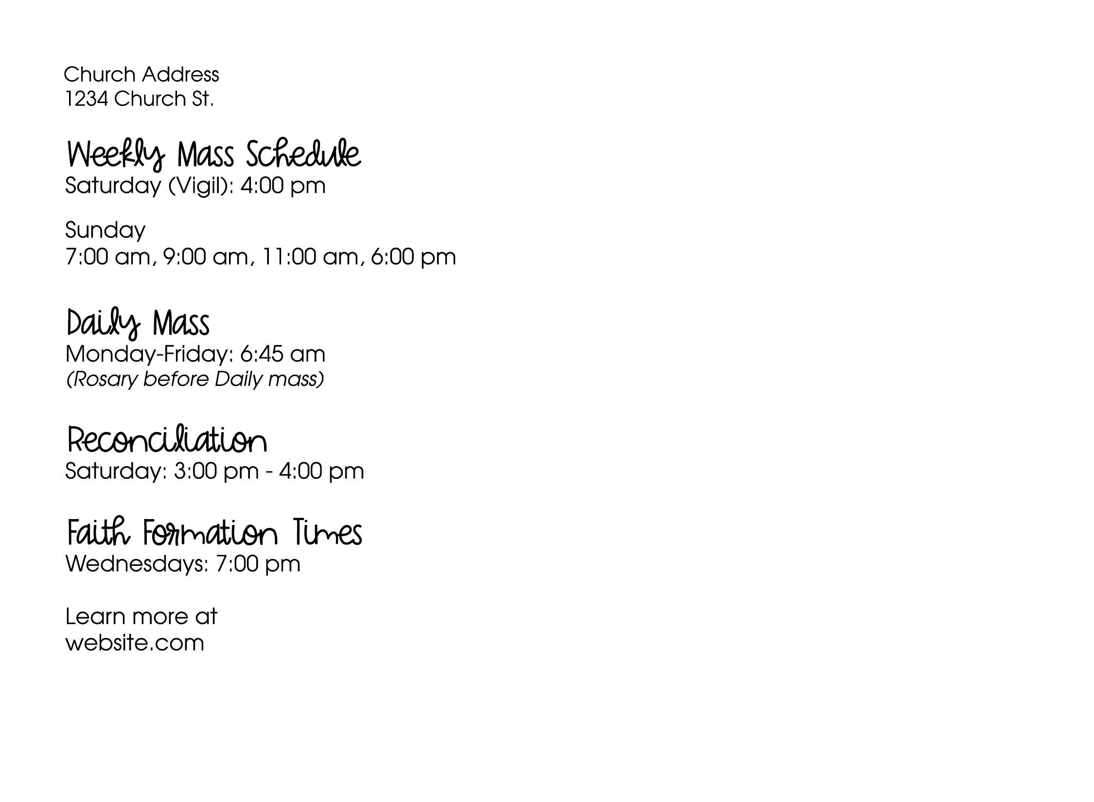 Customize Your Message Mass time postcards are a great way to invite and inform neighbors and parishioners on your Parish. Let your congregation know of mass times and events by personalizing this postcard with custom text.