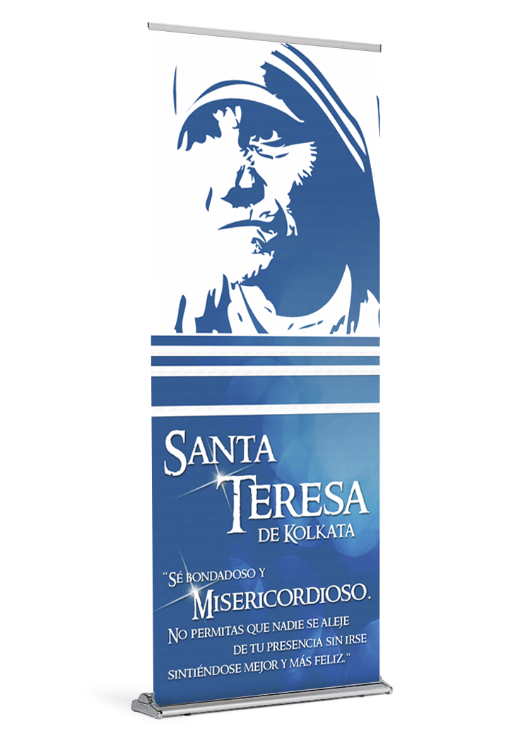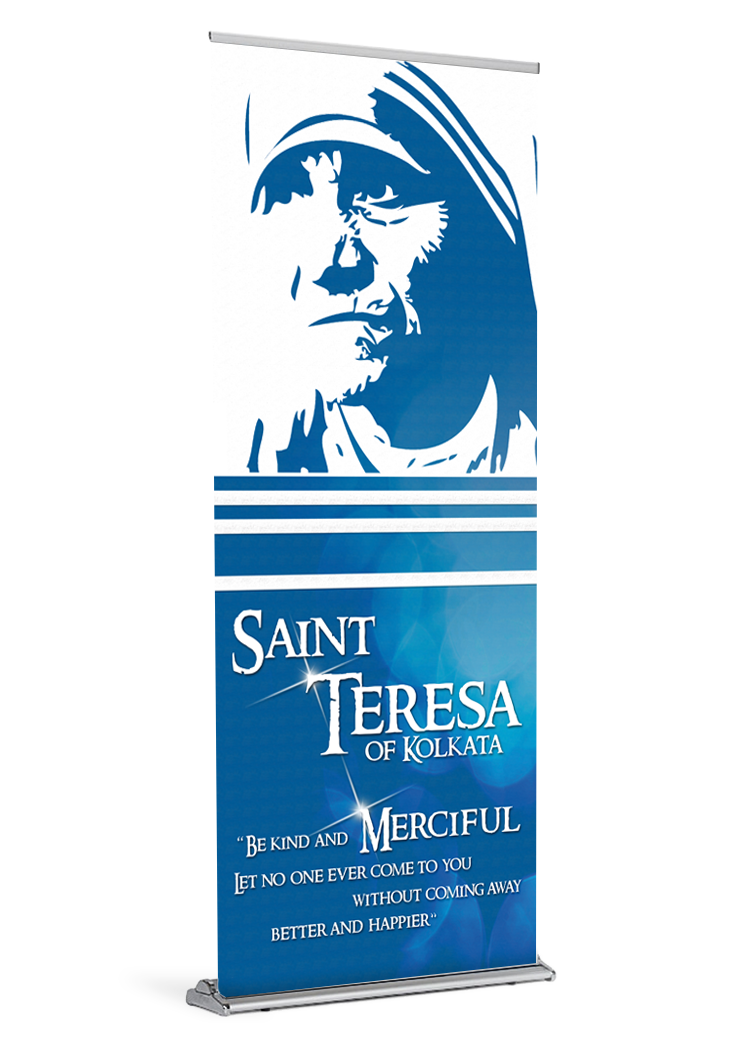 The Church proclaimed her a saint on September 4, 2016: Mother Teresa of Kolkata. This banner, which highlights the simple blue and white habits of the Sisters of Charity, reminds us in a striking way of how we can be Christ-like to others.