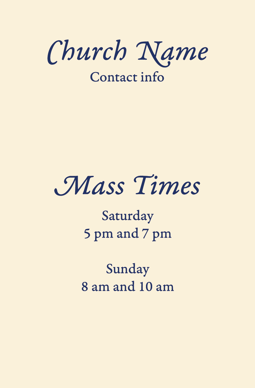 Inform guests of Mass times with a custom message. These premium cards are professionally printed on quality, heavy card stock. They are conveniently sized at 2.75″ x 4.25.” This makes them the perfect size for your pocket, purse, or wallet. The glossy, UV finish makes our prayer cards more durable and will last longer under normal usage.