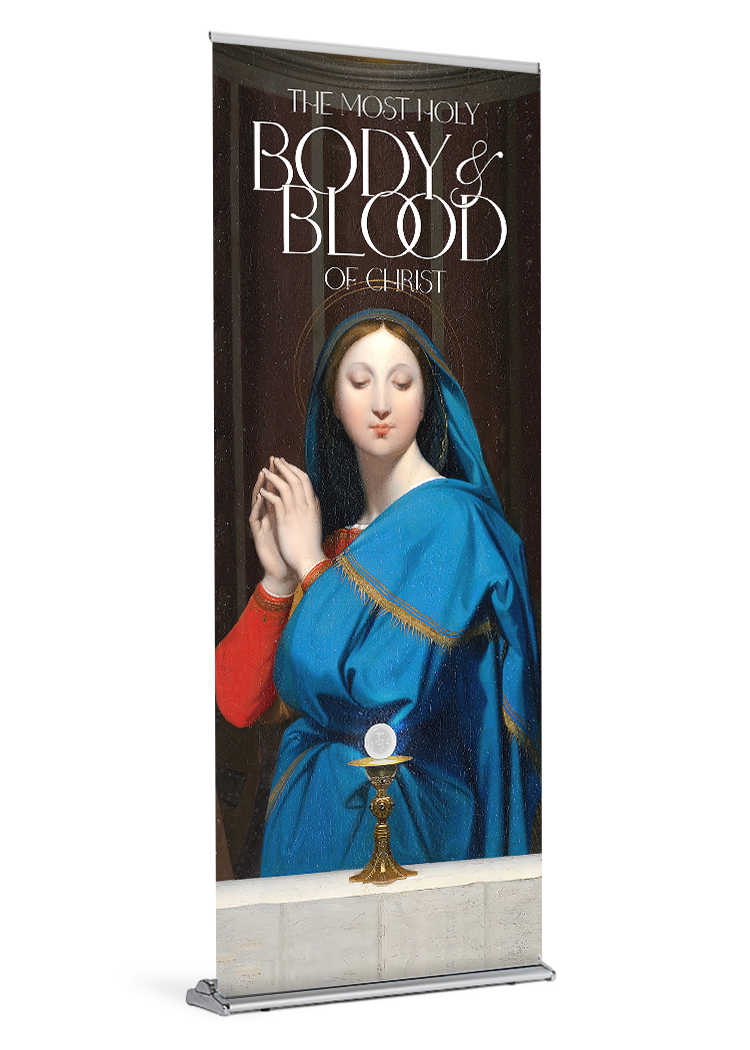 Celebrate our most treasured gift: the Eucharist! This banner is wonderful for the Feast of the Body and Blood of Christ, First Communion, and for Ordinary Time.