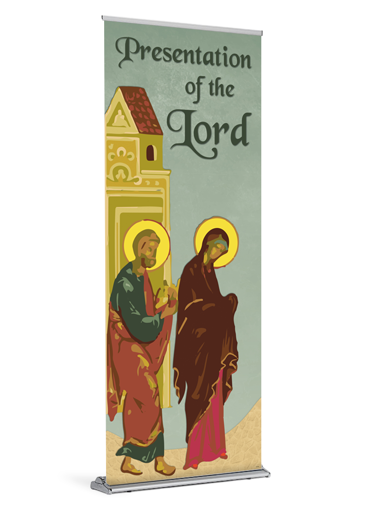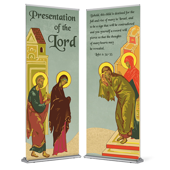 This Presentation of the Lord banner is approximately 84″ tall. It is printed on durable, high quality paper with water resistant inks.