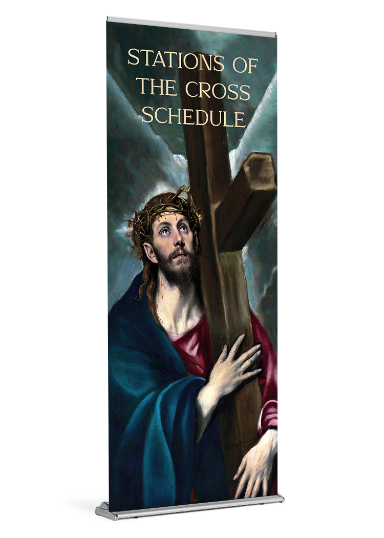 This Lent banner is approximately 84″ tall. It is printed on durable, high quality paper with water resistant inks.
