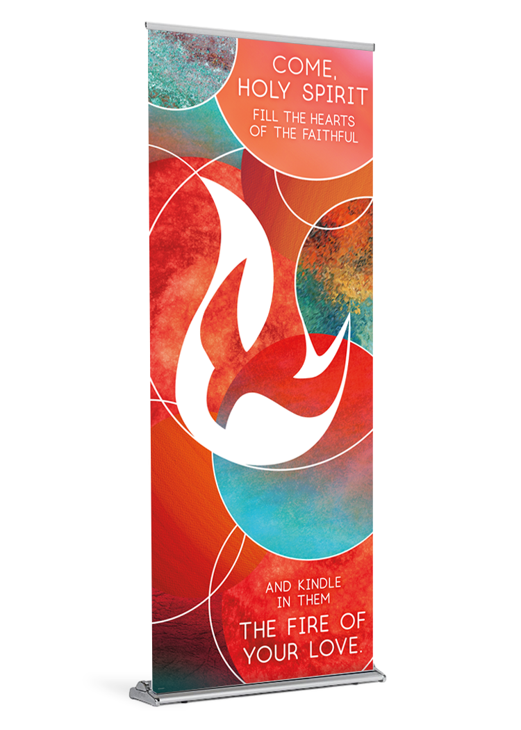 Pentecost is a major feast day in the Church. Celebrated on the Sunday that falls on the 50th day of Easter, it commemorates the descent of the Holy Spirit on the Apostles and other disciples following the Crucifixion, Resurrection, and Ascension of Jesus Christ (Acts 2), and it marks the beginning of the Church’s mission to the world. Pentecost is quite simply the birth of the Church. Celebrate this wondrous event by invoking the Holy Spirit with a beautiful banner for your parish.