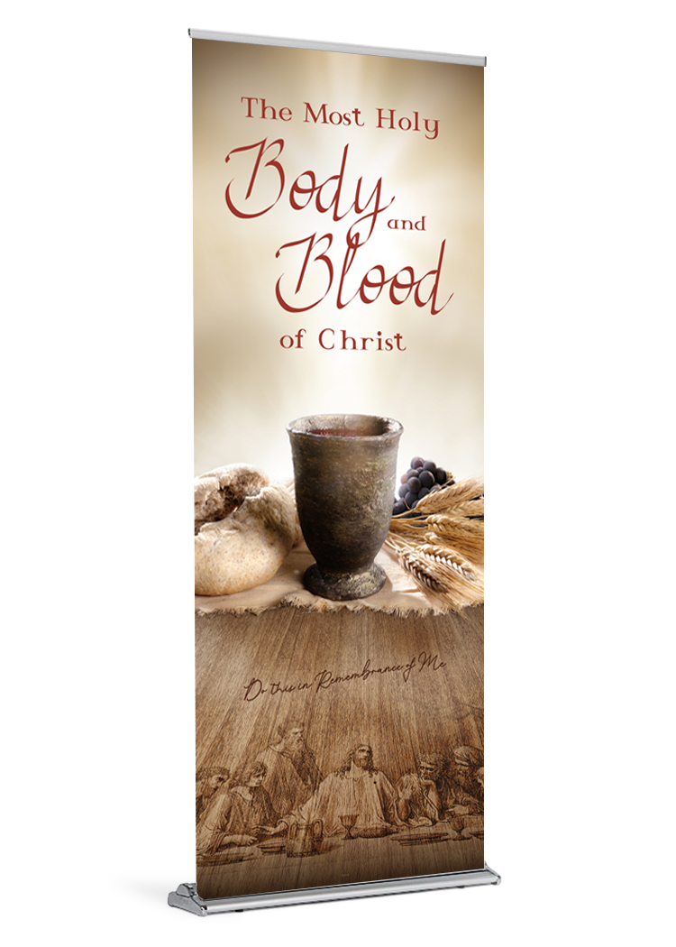 banner banner stand Body and Blood catholic catholic banner catholic banners Christ Corpus Christi Eucharist Jesus Last Supper retractable standProduct Details